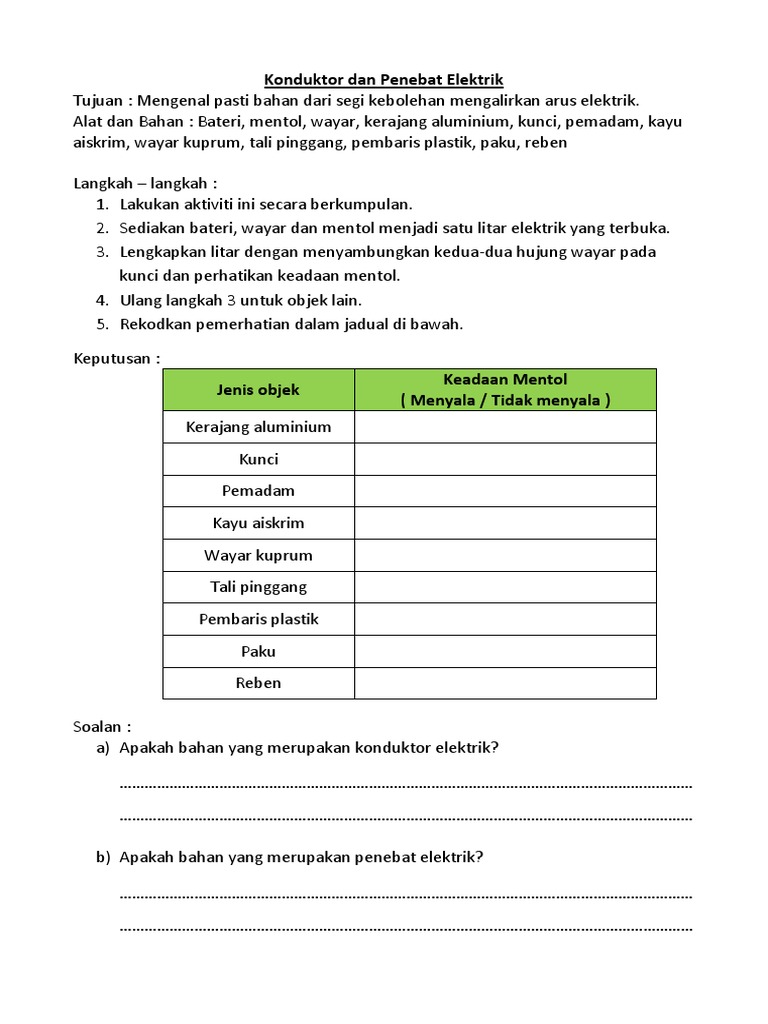 Sifat Bahan Yang Boleh Mengalirkan Arus Elektrik Sains Tahun 4 Worksheet